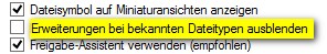 Zeigt Ihr Explorer die Datei-Endungen (z.B. Dateiname.txt) nicht an, so ist in den 'Voreinstellungen' die Anzeige deaktiviert. Sie kann über folgedem Pfad aktiviert werden.